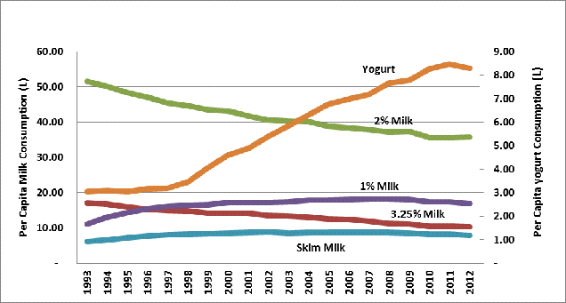 Following table shows the Canadian per capita dairy consumption details: