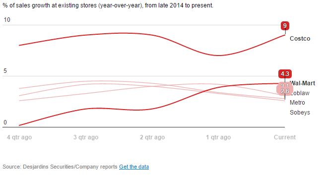 Walmart Canada has 7% of the food retail market and Costco has 10%. With an increase in competition, we would naturally expect the prices to go down.